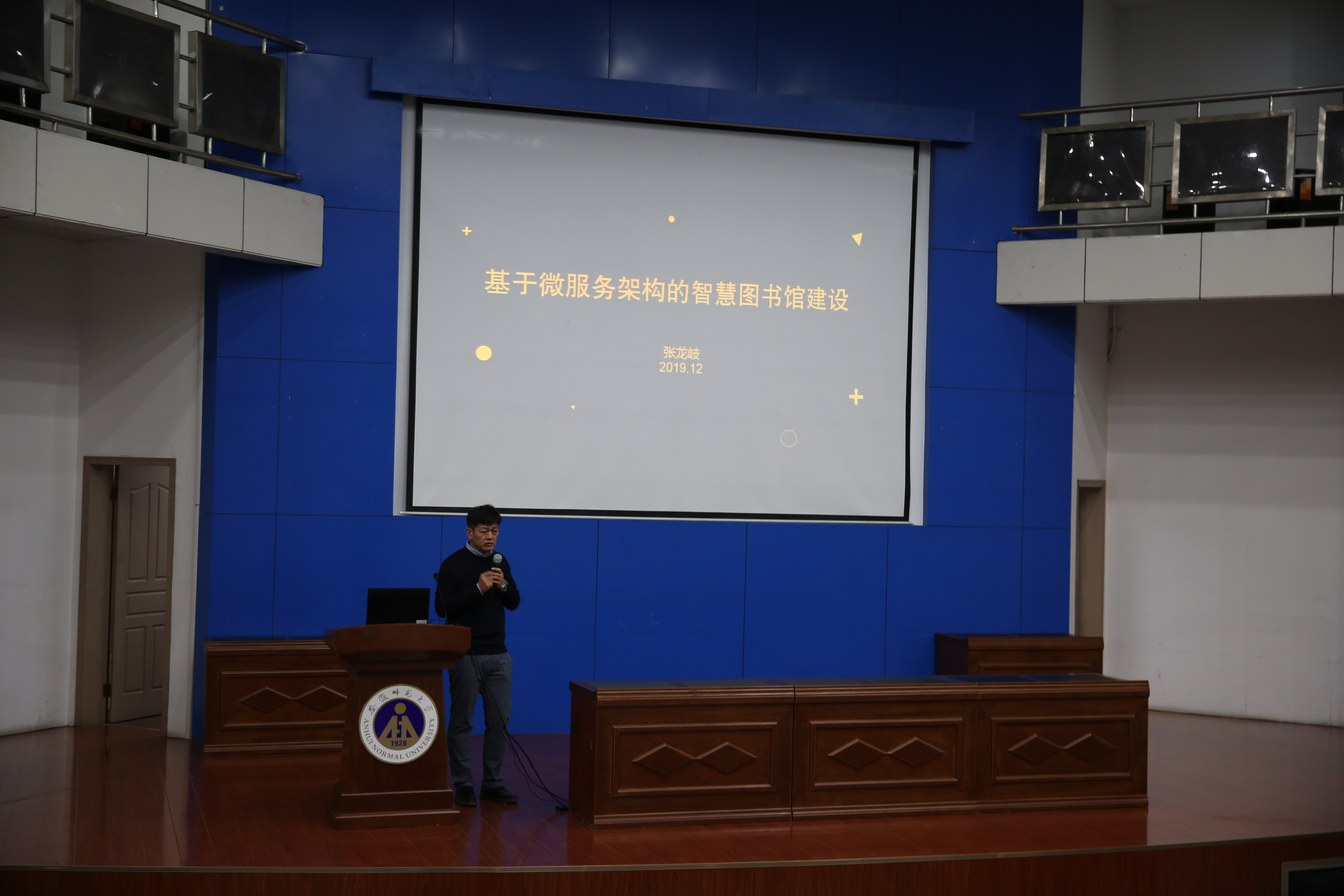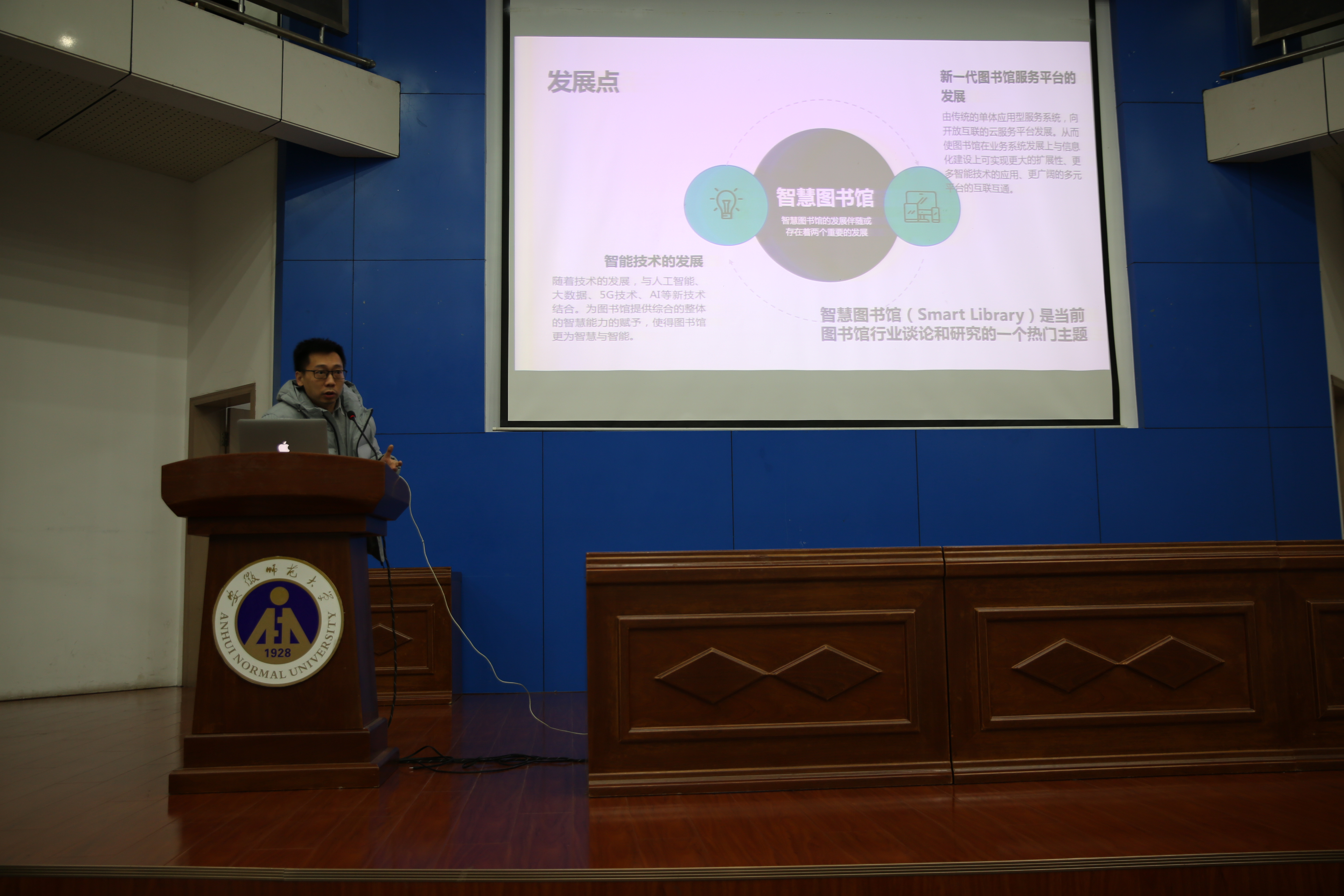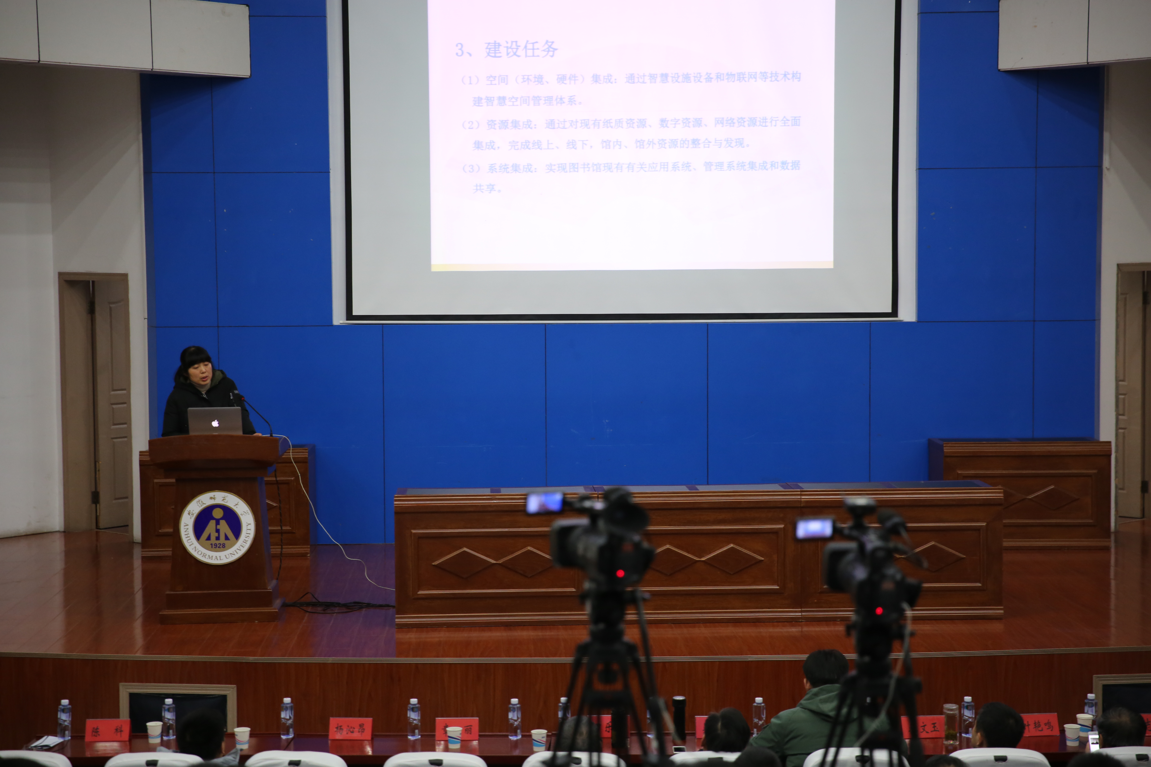 为进一步推动我省高校智慧图书馆的建设,由安徽省高校数字图书馆主办、安徽师范大学图书馆承办、安徽超星信息技术有限公司技术支持的“智慧·融合·跨越:图书馆智慧管理与服务创新研讨会”于12月20日在安徽师范大学图书馆顺利召开。中国科学技术大学图书馆馆长田乐胜、合肥工业大学图书馆馆长陈科、安徽农业大学图书馆馆长吴文革、安徽师范大学图书馆书记程文海、安徽师范大学图书馆馆长方青、安徽师范大学图书馆馆长助理章丽、中国索引协会副理事长叶艳鸣、超星集团副总张龙岐、安徽超星信息技术有限公司总经理秦文玉及来自省内近60所高校的150位图书馆同仁参加了会议,会议分为上下两半场。上半场由合肥工业大学陈科馆长主持。
