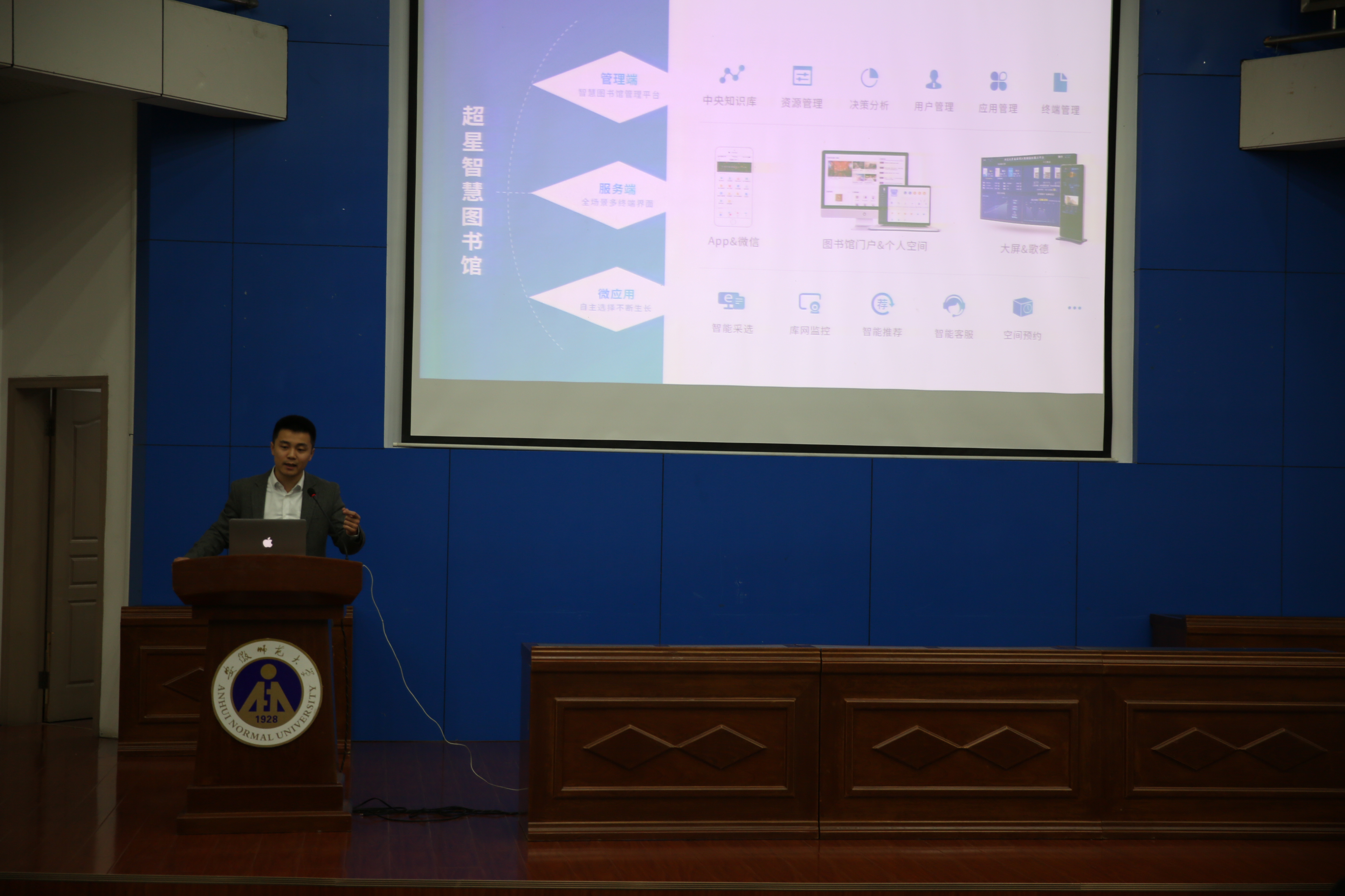 接下来,超星集团智慧图书馆产品总监宋志森介绍了超星智慧图书馆的产品与应用,超星基于多年在行业的深耕,将过去的积累赋能在智慧图书馆的建设中。超星推出的超微智慧图书馆平台目前已经搭建了强大的中央知识库,整合了936个资源库,1240个资源包。并且可以挂接本馆资源,对所有已购电子资源库及包进行统一管理与分析,并对本馆资源管理决策提供辅助依据。超星智慧图书馆主张智慧管理是一种手段,智慧服务为最终目标。在超微平台上,目前已经为中国矿业大学搭建了57个微应用,涉及业务流程、馆员管理、OA办公、读者服务等方方面面。并且通过移动端、pc端、借阅机、微信等6个终端提升本馆管理效率,提供更优质的读者服务。