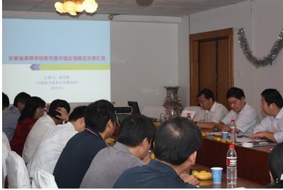 随后,中科大图书馆田乐胜副馆长用详尽的数据及丰富的图表介绍了科大图书馆近年来在数字文献资源、公共服务平台构建及用户信息素养能力培训等方面采取的措 施和成效,以及未来希望成为安徽省资源中心、服务中心及培训中心的建设目标和思路。安徽大学、安徽农业大学、安徽建工学院、合肥工业大学、安徽医科大学、 安徽中医学院、合肥学院、新华学院、安徽广播电大、安徽职业技术学院及安徽工商职业技术学院图书馆负责人也就各自图书馆信息化建设所采取的方法、存在问 题、意见和建议进行了交流。
